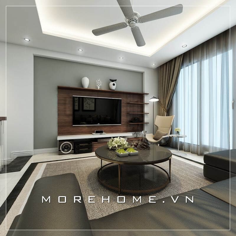 Sử dụng kệ ti vi phòng khách chung cư đơn giản, hiện đại kết hợp rèm cửa uyển chuyển góp phần tạo nên sự tinh tế và sang trọng cho phòng khách.
