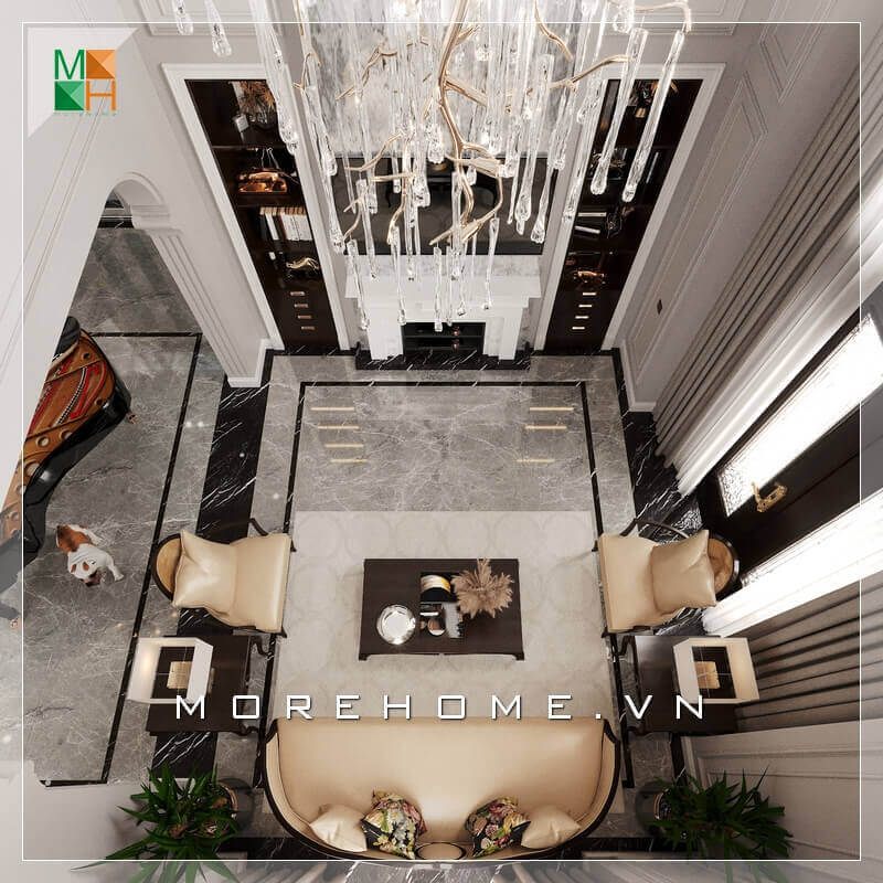 Bàn trà phòng khách màu nâu trầm bóng mượt với những đường nét tinh tế làm nên một điểm nhấn nổi bật cho căn phòng.