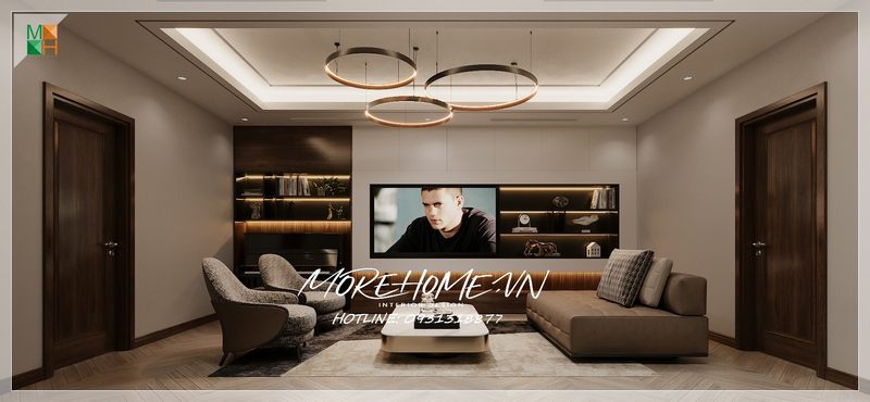 Căn hộ chung cư có diện tích nhỏ nhưng vẫn sang trọng và tiện nghi, thoáng đãng. Nội thất bao gồm sofa hiện đại, dáng văng gọn gàng với chất liệu gỗ óc chó cao cấp.