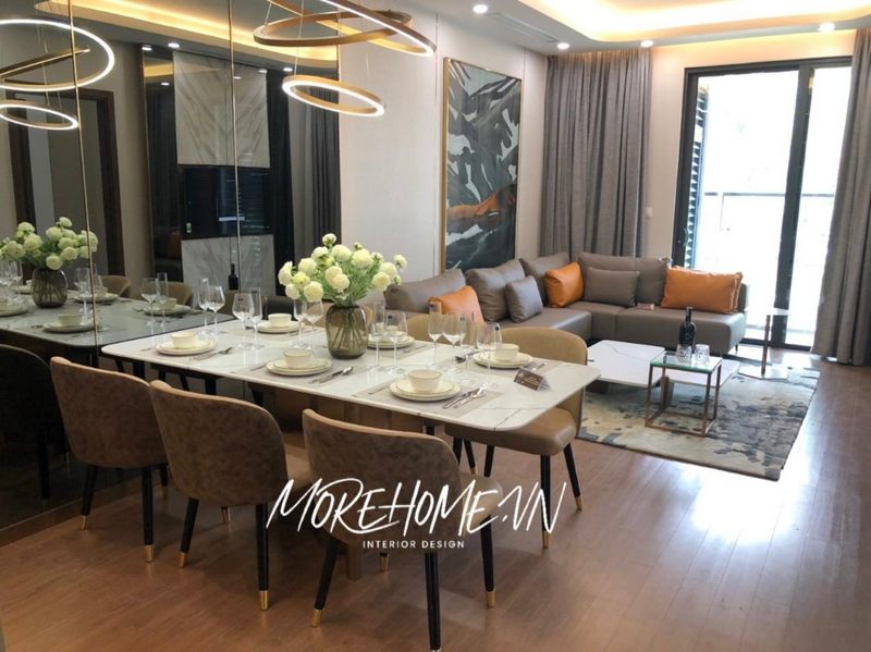 . Công ty nội thất Morehome đã sản xuất và thi công một bộ bàn ăn mặt đá chân inox mạ vàng cùng 10 ghế ăn gỗ óc chó hiện đại.